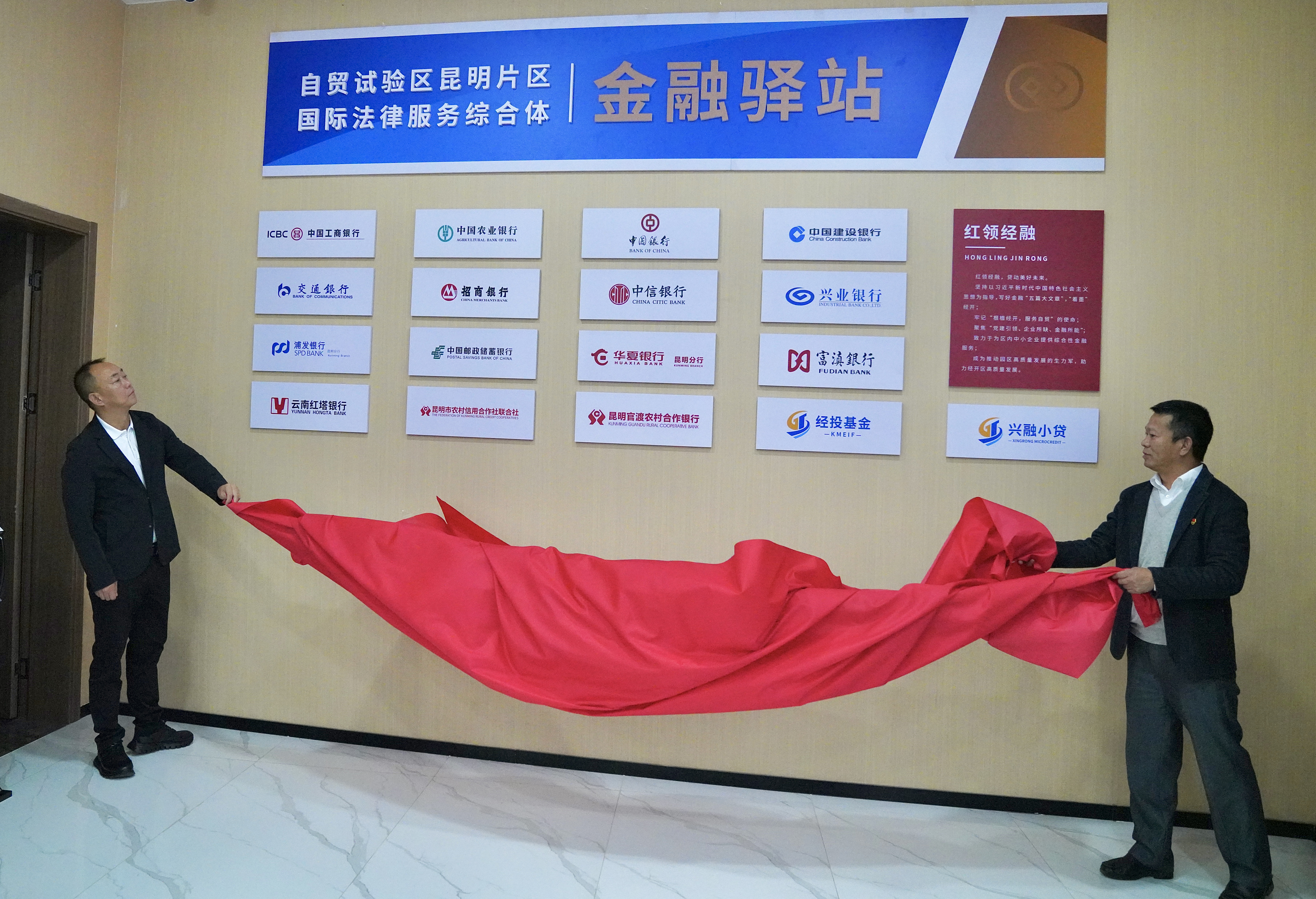 10月12日,昆明經(jīng)開(kāi)區(qū)(自貿(mào)試驗(yàn)區(qū)昆明片區(qū))商務(wù)金融局和昆明經(jīng)濟(jì)技術(shù)開(kāi)發(fā)區(qū)興融小額貸款有限公司(以下簡(jiǎn)稱“小貸公司”)共同舉辦自貿(mào)試驗(yàn)區(qū)昆明片區(qū)國(guó)際法律服務(wù)綜合體金融驛站揭牌儀式暨紅領(lǐng)經(jīng)融服務(wù)站啟動(dòng)儀式。昆明經(jīng)開(kāi)區(qū)(自貿(mào)試驗(yàn)區(qū)昆明片區(qū))管委會(huì)總經(jīng)濟(jì)師、商務(wù)金融局主要領(lǐng)導(dǎo)及分管領(lǐng)導(dǎo)、制度創(chuàng)新部分管領(lǐng)導(dǎo)、小貸公司及經(jīng)投基金公司主要負(fù)責(zé)人、區(qū)內(nèi)各金融機(jī)構(gòu)負(fù)責(zé)人齊聚一堂,共同見(jiàn)證了這一重要時(shí)刻。